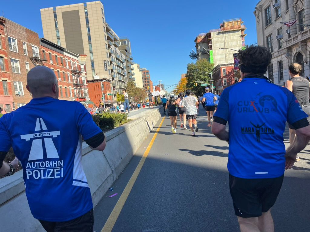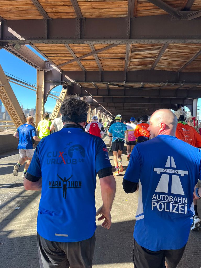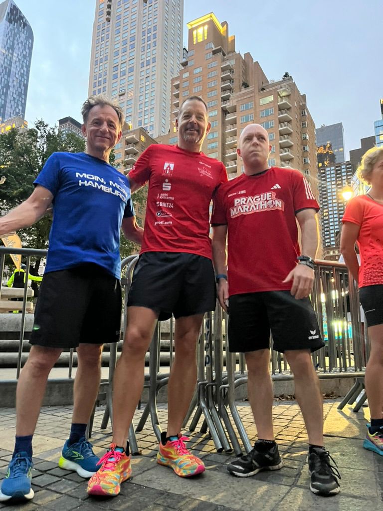 Der weltbeste Triathlonverein Dresden war auch beim New York Marathon am Start. Nach jahrelangen Versuchen über die Lotterie einen Startplatz zu ergattern, wurde diesmal zusammen mit 2 Kumpels entschieden, eine Laufreise zu buchen. Also ging es am Donnerstag 31.10. erst mit dem Auto nach Berlin und dann auch gleich weiter nach New York (Newark). Die Einreise war erstaunlich schmerzfrei, was für den dritten im Bunde (aus Cuxhaven) nicht der Fall war. Bei ihm hat es dann doch 2 Stunden gedauert. Gleich nach der Ankunft im Hotel ging es auf die Laufmesse, um die Startunterlagen abzuholen mit anschließendem Sightseeing quer durch die Stadt. Das Wetter hat mit blauem Himmel und 25 Grad super mitgespielt. Am Abend war dann das Trio komplett.