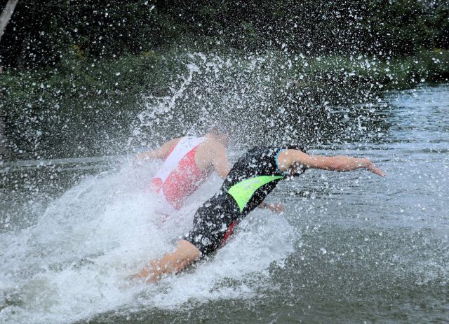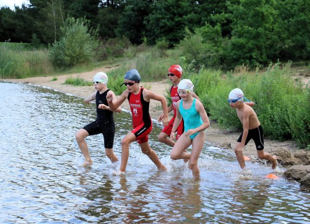 Bei den Junioren und Senioren gab es wieder 2 Durchgänge. 1 Jagdstart mit alters- und geschlechtsbereinigter Startzeit und 1 Massenstart. Geschwommen wurde durch den Natursee in Pirna. Bei den Erwachsenen waren es ca. 500m, bei den Kindern 80m. Anschließenden wurden 2 Runden um den See mit insgesamt 2.600m gelaufen. Bei den Junioren waren es 400m über den Strandbereich. Gegenüber dem Vorjahr ist die Laufstrecke dieses Jahr gleich geblieben, nachdem sich in den Jahren davor durch die Erweiterung des Campingplatzes immer wieder Veränderungen ergaben.