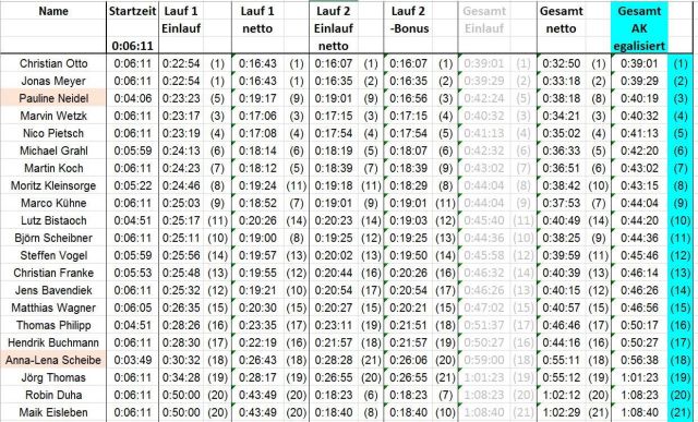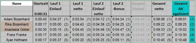 Gewertet wurde nach Reihenfolge der Gesamtzeiten. Bei den Erwachsenen gab es eine Gesamtwertung, bei den Kinden getrennt nach Geschlechtern. Am Ende standen bei den Senioren Christian Otto, Jonas Meyer und Pauline Neidel auf dem Treppchen. Bei den Mädchen waren es Rika Bozenhard und Anastasia Göbel. Bei den Jungen Adam Bozenhard, Franz Franke und Ilyan Hofmann.