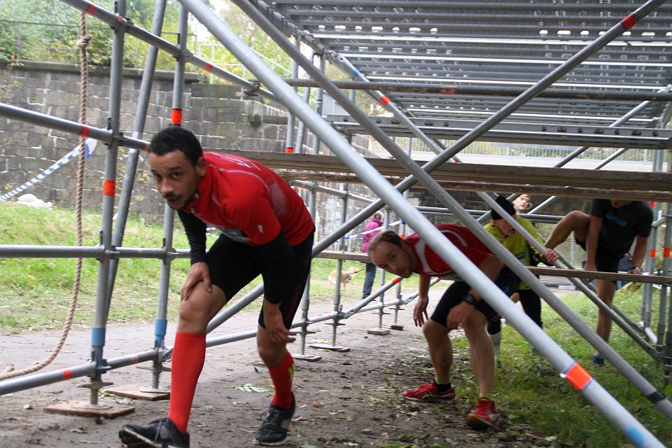 Als nächste Hindernis kam ein kleines Klettergerüst zum hochkrabbeln und von oben runter springen und ein paar Meter danach ging es einen steilen Anstieg nach oben. Ein paar Seile zum Festhalten waren vorhanden, aber mit etwas Schwung ging es auch ohne. Weiter gingen es durch den dunklen Wald, wo völlig unverhofft ein Bär aus dem Gebüsch kam, also schnell weiter, der soll mal die langsameren Starter fressen. Als nächstes Hindernis wartete eine Kombination aus gestapelten Paletten zum überqueren und Hürden zum unterqueren. Nach wieder ein paar entspannten Laufmetern stand ein Auto quer über dem Weg. Zum Glück waren die Türen offen, so konnte man schnell durchkrabbeln, um dann in einem mit einer Abdeckplane zugehängten Tunnel zu stehen. Damit man seinen Weg nicht so schnell raus findet wurde zusätzlich ordentlich Rauch erzeugt und in der Mitte ein weiteres Auto platziert. Zwei Läufer vor mir blieb eine Frau stehen, um sich zu orientieren. Ich konnte zum Glück noch rechtzeitig bremsen, sonst hätte es ein weiteres Hindernis gegeben. Nach dem Tunnel stand zum Abschluss ein weiteres Auto, welches man über die Motorhaube gut überwinden konnte.