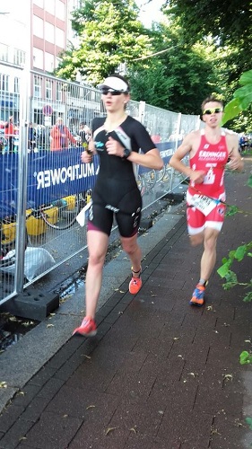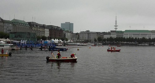 Der Wecker klingelt, es ist 04.20h, also beste Zeit um aufzustehen. Frühstücken und dann auf zur U-Bahn. Danach direkt weiter zum Check-In und den Wechselplatz einrichten. Die Bedingungen waren traumhaft. 17 °C und leichter Regen, so wünscht sich das jeder Triathlet. Viel Zeit war nicht mehr, also rein in den Neoprenanzug und auf zum Start. 3, 2, 1, Go! Schnell anschwimmen und in den Rhythmus finden, soweit lief alles gut. Das Feld war sehr schnell weit gestreckt und ich kam gefühlt ganz gut voran. Nach ein wenig Badespaß in der Alster war dann der Ausstieg in Sicht. Raus aus der Suppe und ab zum Rad. Der Weg dahin war ewig lang, ein guter halber Kilometer barfuß im Neo bis zum Rad rennen, eine ganz neue Erfahrung. Als 19. meiner Welle kam ich aus dem Wasser, soweit ganz ok, denn jetzt kommt ja meine stärkste Disziplin – das Radfahren.