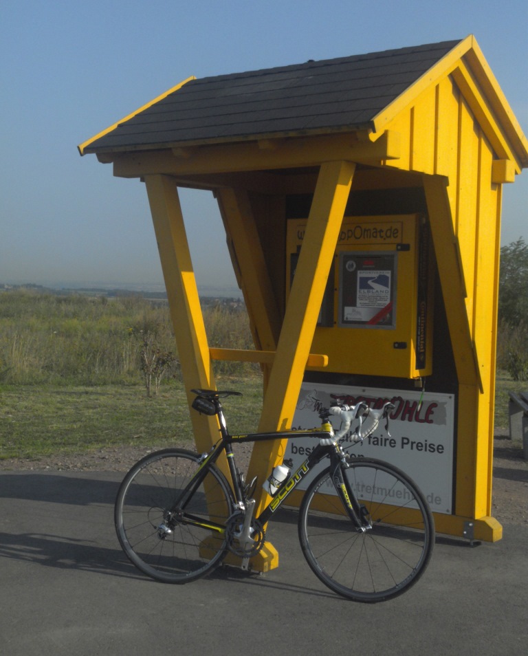 Für alle, die nicht wissen, was ein Stoppomat ist und nicht bei Wikipedia recherchieren wollen, hier ein Tipp von mir: Der SV Elbland Coswig betreibt den einzigen Stoppomaten im Osten. Ich finde die Einrichtung sensationell, weil man einen Vergleich hat, wie schnell man bergauf mit dem Rad ist. Die Strecke ist ca. 4500 m lang, verschönt durch 186 Höhenmeter. Am Start zieht man eine Karte, stempelt seine Zeit und dann geht es so schnell wie möglich (die markierte Strecke) bergauf. Oben wird wieder gestempelt. Wenn man mit seiner Zeit einverstanden ist, wirft man die Karte ein und ein paar Tage später findet man sein Ergebnis auf www.stoppomat.de.