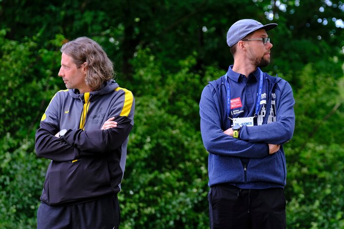 Die Teams treffen sich dem Ablaufplan folgenden am Line-up. Hier ruft der Sprecher die Teams nach aktueller Tabelle auf und verkündet die namentliche Startaufstellung. Die Anspannung steigt. Für die Athletinnen und Athleten sinkt die Umgebungstemperatur um gefühlt 10 Grad Celsius. Sobald ein Team aufgerufen ist, sucht es sich fix eine Startbox auf dem blauen Teppich aus und verharrt dort. Man darf z.B. nicht nochmal zum Wasser laufen, um die Brille naß zu machen. Je weiter hinten in der Tabelle das Team rangiert, desto weniger Entscheidungsmöglichkeiten bleiben. Eine kleine Motivation für das Rennen, um die Ausgangslage für das nächste Rennen zu verbessern ;-)