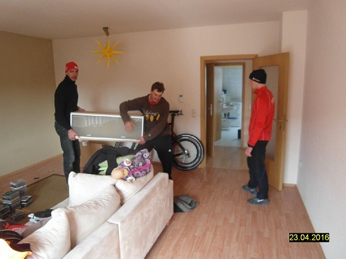 Nach einer kurzen schmerzlosen Ansage folgten Fugi nebst Lebensgefährtin Katrin, Max, Marvin, Danny, Marco und die Vereinsfreunde Jenser und Zaisi unserer Einladung zum Umzug. Wie es sich gehört, machte der harte Kern eine ordentliche Koppeleinheit daraus: Max, Marvin und Danny fuhren -über einige ungewollte bergige Umwege- mit dem Rad nach Paulsdorf, räumten ca. vier Stunden um (Stabilisationstraining!) und fuhren dann wieder per Rad zurück.