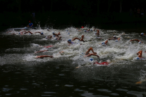 Wir durften dann nun auch endlich 15:50 Uhr über die Sprintdistanz ran. Nach dem Einschwimmen „stellten“ wir uns an der gedachten Startlinie zwischen zwei Bojen auf, warteten noch auf ein Paddelboot, was sich auf die Schwimmstrecke verirrt hatte, und dann ertönte auch schon die Starttröte. Ich stellte mich ganz vorne mit auf, um so wenig wie möglich zu verlieren. Leider bekam ich nach wenigen Metern einen Fußtritt gegen den Kopf, später verschluckte ich jede Menge von dem spritgeschwängertem Hafenwasser, was mich etwas aus dem Rhythmus brachte. Glücklicherweise hatte ich Pauline zu mindest bis zur Wendeboje immer im Blick, was mich positiv stimmte. Wir blieben im Hafen, wendeten also an der Boje und schwammen wieder entlang der Boote Richtung Ausstieg. Durch die Strömung erschien der Rückweg etwas länger. Gegen die starken Schwimmerinnen haben wir nix entgegenzusetzen. Fast geschlossen kamen wir aus dem Wasser: Pauline als 14., ich als 17., Manu als 19. und Jule als 20.