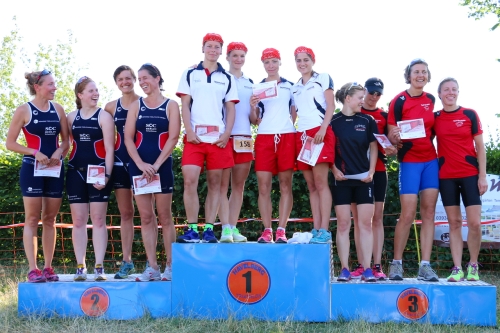 Vorsichtig die Badekappe runter, schließlich durfte die tolle Frisur nicht zerstört werden, ab zum Radel, Helm auf, Nummer um und rauf aufs Rad. 11 km hin und 11 km zurück…ziemlich unspektakulär! Da mir in der Wechselzone nicht gesagt wurde, auf welcher Position ich mich befinde, sah ich erst kurz vorm Wendepunkt, wie viele noch vor mir waren. Als 2. ging ich auf die Laufstrecke. Manu hatte auch gut Druck auf der Pedale und folgte nur 1,5 min später. Pauline und Jule, die von ihrer ersten Langdistanz vor einer Woche ziemlich schwere Beine hatte, folgten fast zugleich nochmal 1,5 min nach Manu. Wir hatten 3 kleine Hafenrunden zu laufen, also 6,3 km. Für mich waren die, wie immer sehr hart. Manu und Pauline laufen immer super, also kam es auf mich drauf an. Mich überholten aber nicht so viele und davon nur eine von den TuS (sen). Kurz vor Schluss kam dann auch noch Pauline, so dass wir als 6. und 7. Hand in Hand jubelnd ins Ziel laufen konnten. Für mich war klar, dass es dieses Mal reichen musste. Manu war als 3. eingelaufen und blieb damit sogar vor der ersten TuS (se). Jule schloss unser super Mannschaftsergebnis mit einem hervorragenden 11. Platz ab. Und tatsächlich, wir durften uns ganz nach oben auf‘s Treppchen stellen. Damit bescherten wir Manu ihren ersten Sieg mit einer Mannschaft in der Regionalliga! Nicht nur unser Sieg war es, was uns so happy gemacht hat, sondern auch, dass die Mädels von SCC Berlin sich noch vor die TuS (sen) von Berlin Neukölln geschoben haben. Somit sind wir punktgleich mit ihnen und der letzte Wettkampf wird die Entscheidung bringen. Wir sind auf jeden Fall jetzt schon heiß auf den spannenden Kampf!