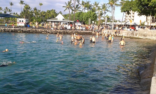 Das absolute Highlight war aber eigentlich wieder das allmorgendliche Schwimmtraining mit Start am Pier von Kona. Hier trafen sich die startenden Sachsen regelmäßig und es wurden Erlebnisse und Wetterprognosen für den Renntag ausgetauscht. Die Stimmung war jeden Morgen unbeschreiblich und das Schwimmen im öffentlichen Aquarium ist einfach super schön. Wenn es dann am Coffeeboat noch etwas Kona-Kaffee gibt, kann der Tag nur noch super werden.