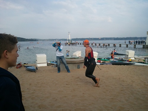 Gleich in den Wechselgarten alles fertig gemacht, noch nen Riegel in den Kopf und runter zum Strand…hab mich dann nochmal kurz eingepaddelt, weil der Wannsee extrem flach reingeht…gar nicht so einfach das Paddel so flach einzusetzen! Ich durfte mein Boot dann noch in die erste Reihe legen…und dann nun auf zum Schwimmstart…der war am anderen Ende vom Bad…die Zeit wurde knapp…ich ließ mir noch mal die Wege erklären, nicht, dass ich was falsch mache…und somit sinnlos Zeit verlieren würde. Ich sah schon von weiten, dass alle schon im Wasser standen…also schnell den Neo an, fix ins kühle Wasser gerannt, dann bis zum Start geschwommen, und dann ging’s auch schon los ;-)