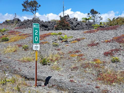 Für den Antritt der Fahrt selbst wurde ich am Tag zwischen den beiden Ironman-Weltmeisterschaftsläufen (Do-Frauen, Sa-Männer) von meinen lieben Gastgebern Manu und Enrico früh um 06.00 Uhr auf die andere Inselseite nach Hilo gefahren. Unterwegs richtete ich an ausgesuchter Stelle ein Getränkedepot ein, um die Flüssigkeitsversorgung sicherstellen zu können. Und kurz nach 07.30 Uhr konnte es bei sonnigem und windstillem Wetter losgehen. Das erste Viertel (hm) führt durch die weitere Ortslage von Hilo und ist vegetativ und auch aufgrund der urbanen Eindrücke der abwechslungsreichste Abschnitt. Entsprechend der sich mit der Höhe fortlaufenden Änderung der klimatischen Bedingungen wurden die optischen Impressionen zunehmend karger.