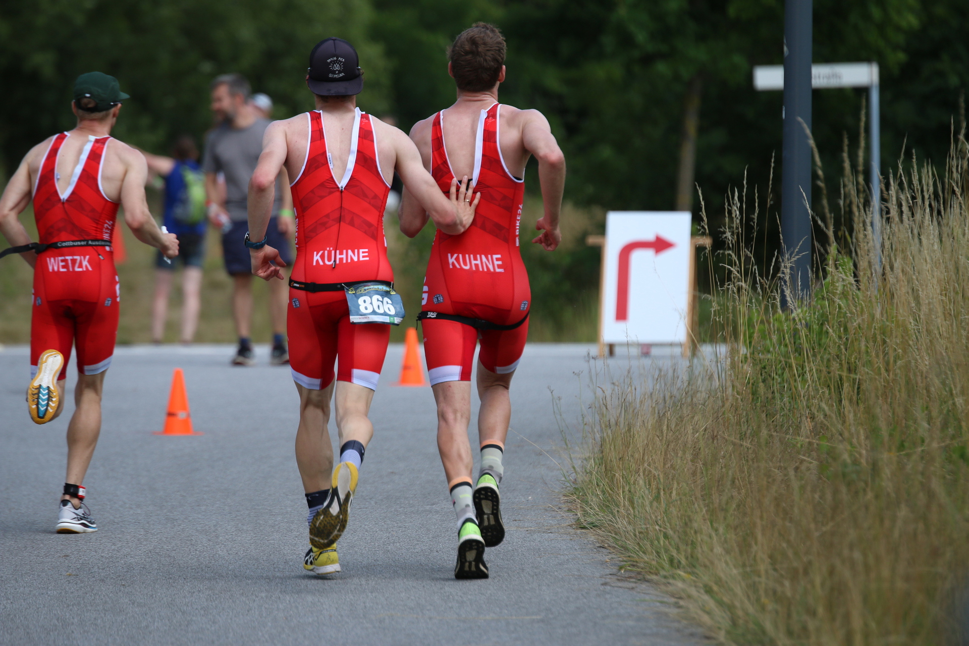 Nach kurzer Verschnaufpause startete der 2. Teil des Wettkampfs. Mit den Abständen vom Radfahren waren nacheinander pro Mannschaftsmitglied je 400m (Männer) bzw. 200m (Damen) zu schwimmen. Zusammen mit dem letzten Schwimmer ging es anschließend als Team auf die 5 km lange Laufrunde. Diese war einmal (Damen) bzw. zweimal (Männer) zu absolvieren. Der Untergrund variierte von schönstem Asphalt über frisch gemähte Wiese bis zu feuchtem Waldboden. Besonderheit des Teamformats war, dass nur zwei Damen bzw. drei Männer das Ziel erreichen mussten. Während andere Teams diese Regel schon direkt nach der Wechselzone nutzten und nur zu dritt auf die ersten Kilometer gingen, konnten wir immerhin bis km 3 zusammenbleiben. In einer schnellen bergab Passage konnte Stephan das Tempo jedoch nicht mitgehen und musste reißen lassen. Nunmehr zu dritt, folgte ab Kilometer 6 für mich als schwächsten der verbliebenen Läufer eine neue Erfahrung. Um nicht zu sehr an Tempo zu verlieren, wurde ich von Zeit zu Zeit von Marco und Marvin angeschoben.
