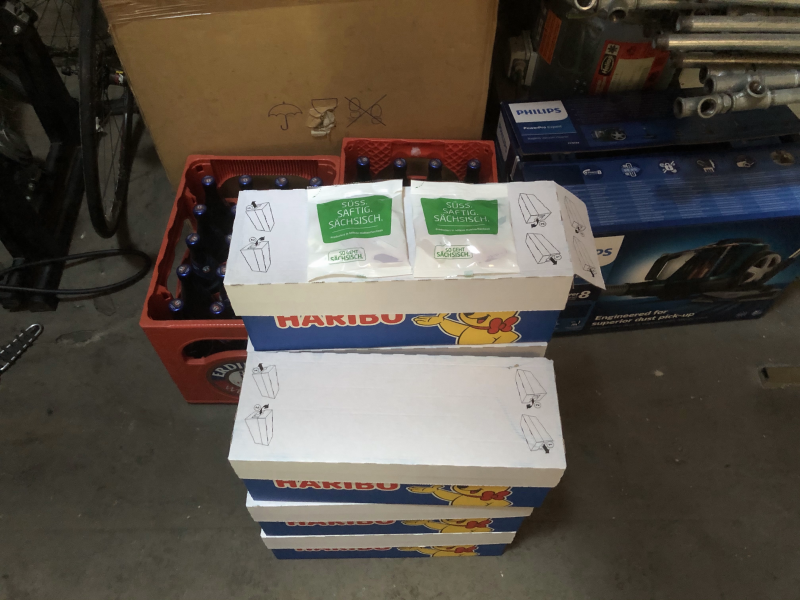 Die Abholung wurde gleich als Krafteinheit auf dem Rad durchgeführt. Mit Anhänger und 20 kg Zuladung ging es von der sächsischen Staatskanzlei zum Athletikraum wo die Leckerei aktuell lagert. Gummibärchen sind die ideale sächsische Sportverpflegung, da sie ohne harte Konsonanten auskommen.