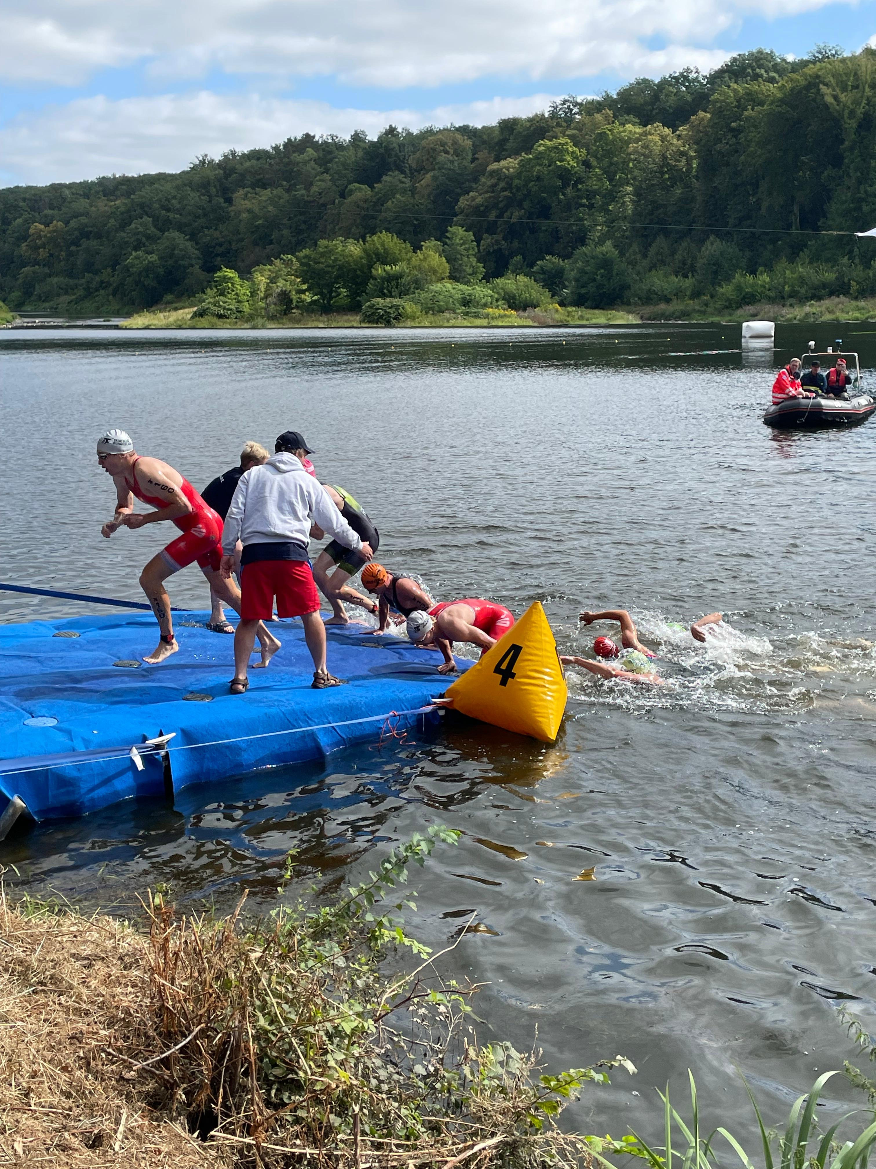 Die Zeit zum Einchecken der Räder hatte für die Damen, die schon 9 Uhr starten sollten, nicht viel Puffer, sodass sich direkt danach warm gemacht wurde. Zu dieser Zeit war das Wasser wärmer als die Luft. Durch das Line-Up vor dem Start waren nur wenige vorher Einschwimmen, um draußen nicht zu lange im nassen Einteiler stehen und frieren zu müssen.