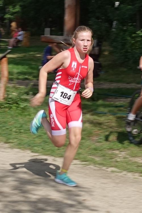 Dann sind wir Einchecken gegangen, bereiteten unsere Plätze vor und zogen die Einteiler an. Nach einem kurzen Lauf-ABC gings schon zum Start. Da alle Kinderaltersklassen zusammen starteten, war der Start ziemlich durcheinander. Aus dem hüfttiefen Wasser ging es los.