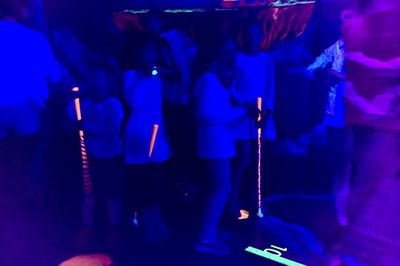 Wir waren im BLACKLUXX auf der Emilienstraße 20 zum 3D-Golfen im Dunklen. Als erstes wurden Teams mit je 5 Golfern gebildet, dann ging es zur Schläger- und Brillenausgabe und danach direkt rein ins Dunkle.