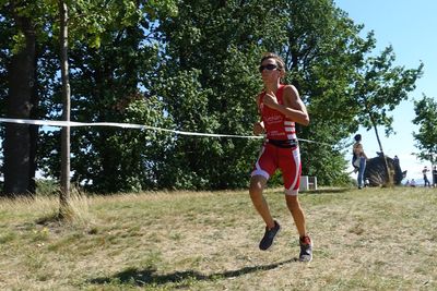 10:48 Uhr startete die Altersklasse Jugend B mit Finn, Clara, Lydia, Marleen und ich. Finn kam mit 7 Sekunden Rückstand aus dem Wasser und kam vom Radfahren mit 2,5 Minuten Vorsprung zurück. Beim Laufen holte er sich nochmals ein Minute Vorsprung.
