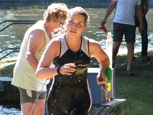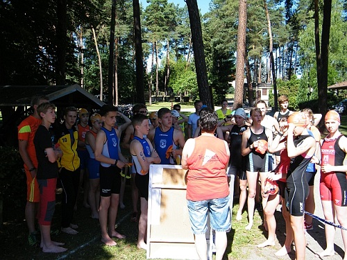 Wasser: 22°C – ohne Wasserpflanzen; Luft: 32°C - erster heißer Tag in der anstehenden Hitzewelle, aber es gab Schatten und Abkühlung durch Getränke und Obst genug unter den hohen Fichten; Einsatz: enorm! Der Kurzsprint als Einzelwettkampf brachte schon eine kleine Vorentscheidung: Sportgymnasium Leipzig zeigte sich souverän. Unter den 3 verbliebenen Teams waren die Abstände nach der Addition der jeweils 3 zeitschnellsten Mädchen und Jungen sehr eng – Sekundenabstände. Alles also noch offen für die Teamstaffeln.