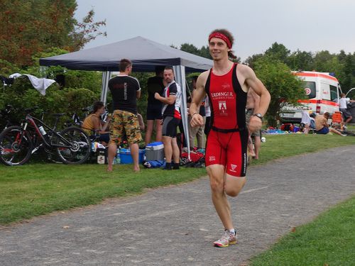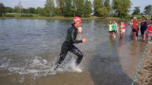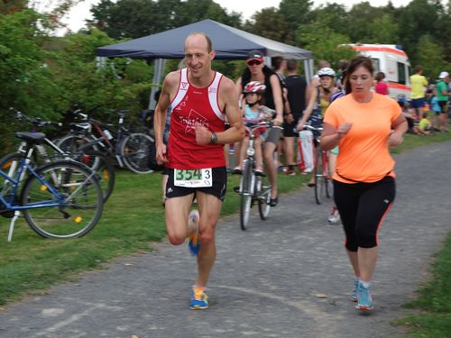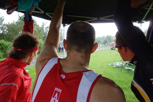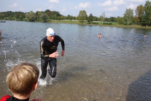 Martin stürzte sich wagemutig in der Startgruppe in den Teich und spulte die 360 m souverän mit nur wenigen Vorausschwimmenden ab. Maxs Position, der nach dem Abschlag an Land etwas konfus die Richtung suchte, war bei Wechsel zu Jörg aufgrund der bereits beginnenden Überrundung nicht mehr auszumachen. Jörg umplätscherte gleichfalls dutzende Brustschwimmer und nach etwas mehr als 12 Minuten schon war wieder Martin mit dem Radl an der Reihe.