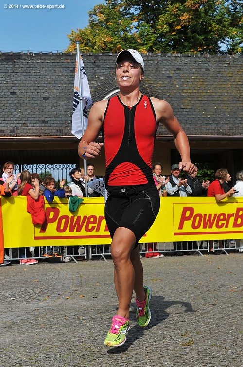 Bis zur ersten Boje waren es nur etwa 100 m, dann folgte eine 170°-Kurve nach links und dann immer geradeaus parallel zum Strand. Auf den ersten 50 m war mächtiges Gewühl, aber an der Boje hatte ich glücklicherweise Platz und dann konnte ich mein Ding schwimmen…fühlte sich gut an und ich überholte einige. So kam ich nach 750 m als 4. Frau hinter Kerstin, Lisa und Antje aus dem Wasser. Ich stapfte durch den tiefen Sand zum Boot, kämpfte mich aus dem Neo und schnappte mir mein Paddel und das Boot und los ging’s. Durch das Schwimmen war das Gefühl in den Fingern weg und der Wind und die Wellen machten es nicht wirklich einfacher…erst mal Ruhe bewahren und vorsichtig anfangen. An der ersten Boje lag auch schon der erste im Wasser…Einen knappen Kilometer (von vieren) habe ich gebraucht, eh ich richtig loslegen konnte…wirklich keine einfache Angelegenheit heute…da sah ich auch schon Antje. Ich überholte sie in der Kurve, die sie zu weit ausfuhr, und gab ihr damit keine Möglichkeit auf meiner Welle mitzufahren. Kurz darauf überholte ich auch Lisa, die es fairerweise nicht mal probierte. Jetzt hatte ich noch eine Runde Zeit meinen Vorsprung zu den beiden auszubauen. Die erste Frau, Kerstin, sah ich zwar, kam aber nicht näher. Also wieder an den Strand, vorsichtig, weil flach, Boot abgelegt und nun hieß es knapp 90 Stufen hoch zur Wechselzone…Jippie! Ich stieg hinauf und lief dann zum Radel, Helm auf und los…Schon nach den ersten Kilometern sah ich nun Kerstin, ich kam schnell näher und schwupp war ich nun die Führende. Ich fuhr die 24 km sehr kontrolliert, wollte nichts übers Bein brechen, da ich ordentlich Respekt vor dem Lauf hatte, der die letzten Wettkämpfe eher nicht so fluffig war. Ich kam also nach dem Rad, was nicht flach und nicht bergig war, aber gut selektiv, als erste in den Wechselgarten. Fix die Laufschuhe an, Mütze geschnappt und los. Und gleich schon als ich loslief, merkte ich, dass es heute gut geht. Ich war froh und hoffte nun, dass der Vorsprung reichen würde. Die Strecke führte erst etwas durch den Wald, dann auf dem Fußweg parallel zur Radstrecke und dann noch eine elend lange Gerade durch den Wald…da werden die 5 km mächtig lang…und mein Magen machte sich nun bemerkbar…am Ende der Geraden, als ich mich nochmal umschaute und Antje nicht sah, wusste ich, dass ich es geschafft hatte…die letzten paar Meter waren dann Gänsehaut pur! Die ganzen Leute, die einen lautstark anfeuerten, mein Name, der gerufen wurde…schon ganz schön schön :-D Einige paar Minuten später meldete sich dann mein Magen zwar noch mal und ich rief den Ulf an, aber egal! WELTMEISTERIN! Echt komisch, das zu sagen! Antje lief 1 Minute und Lisa über 3 Minuten nach mir ins Ziel.