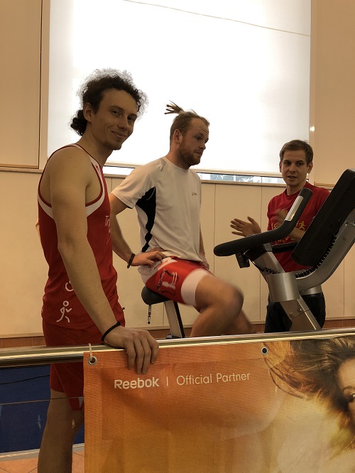 Gestartet wurde in drei Wellen über jeweils 275 m Schwimmen, 5 km Radfahren auf dem Fitnessbike und anschließend 1,5 km auf dem Laufband. Da wurde schon ordentlich Ballett gemacht, aber was sich wohl als kräftezehrendste Herausforderung an diesem Tag herausstellte war das ununterbrochene zufächeln von Frischluft für die aktiven Athleten… So war zumindestens unser erstes Fazit als wir uns am Sonntagmorgen alle etwas verkrampft aus dem Bett hievten.