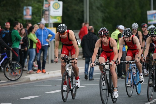 Der Start des 20km Teamzeitfahrens erfolgte auf einem vollgesperrten Teil des Jenaer Stadtrings mit den Abständen, die sich aus den Differenz der Teamzeiten des Aquathlons und der Bonuszeiten ergaben.