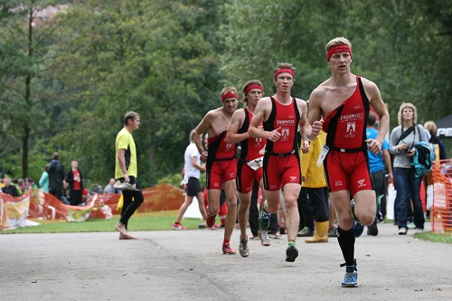 Mörg machte den Anfang und legte als Erster aus dem Wasser, fulminant wechselnd und als Startwellen-Zweiter gut vor. Für solch super kurze Schwimmen hatte er die neueste Entwicklung eines Neoprenherstellers eingepackt: Das Neopren reicht nur bis zu den Knien und soll somit einen hyperschnellen Wechsel ermöglichen. Das das Gerät wie ein 10Jahre alter Neopren mit halb abgeschnitten Beinen aussah, war wahrscheinlich nur Tarnung seitens des Herstellers. Als Nächster war ich an der Reihe, gelangte mit selten schweren Armen aus dem See und lief dem Ersten meiner Startwelle keuchend ins Ziel hinterher. Dann packte Martin seine imaginären Flossen aus und schwammlief durch den See und Matschrasen mit einer klasse Endzeit.