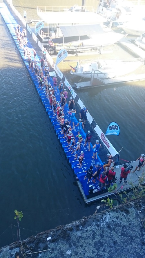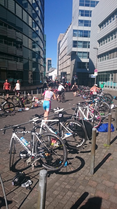 Um 06:00 Uhr am Sonntagmorgen klingelte das Handy. 6:30 Uhr ein kleines Frühstück, soweit mein Magen mitspielte. Gegen 7:15 Uhr dann zum Check in. Ich musste die gesamte Wechselzone nach vorn laufen, da dort die Starter der Deutschen Meisterschaften standen.Ca. 400 Meter feinstes Kopfsteinpflaster sollten dann nach dem Schwimmen mit dem Rad in der Hand zurückgelegt werden.