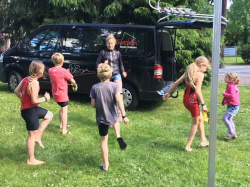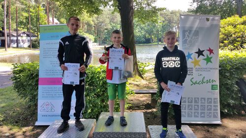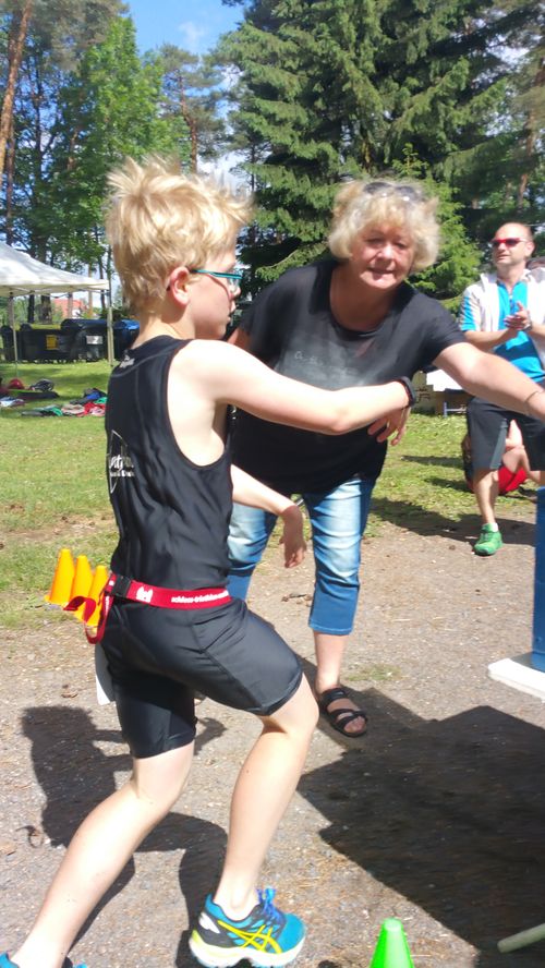 Bis es soweit war, vertrieben wir uns die Zeit mit Eis essen und Fußball spielen. Und natürlich haben wir auch den Großen noch beim Wettkampf zugesehen. Christian war dann um 12 Uhr auch endlich dran. Wir feuerten ihn kräftig an. Nach 250 m Schwimmen, 5 km Rad fahren und 1,5 km Laufen musste er sich drei Teilnehmern vom Städtischen Gymnasium Riesa geschlagen geben und landete auf einem guten 4. Platz.