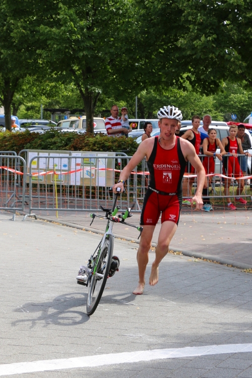 Die Masters starteten 10 min später und hatten die gleiche Strecke zu bewältigen. Nach dem Startschuss setzte sich sogleich in bekannter Manier Gert, the Fish, Fischer an die Spitze und baute seinen Vorsprung bis zum ersten Wechsel auf knapp 2 min aus. Katja folgte im vorderen Drittel, Jörg im Mittelfeld und Holm stieg im hinteren Drittel aus den Fluten. Für ihn beginnt der Wettkampf erst auf dem Rad. Und das hat er auch gezeigt. Auf dem Rad pflügte Holm durchs Feld und durch seinen sehr guten Lauf schob er sich noch vor auf den 6. Platz. Gert profitierte immerhin teamintern bis zuletzt von seiner Schwimmdominanz, so dass er als 2. vom Team als 22. einlief. Katja machte einen sehr guten Wettkampf in dem Männerfeld und schloss als 25. einige Sekunden vor Jörg ab, der 28. wurde. Das Mastersteam erreichte damit den 6. Platz in der Tageswertung und kletterten damit in der Gesamtwertung einen Platz nach oben auf die 7. Schade, dass die Boni für Damen und ältere Männer abgeschafft wurden, sonst sähe die Tabelle sicherlich anders aus.
