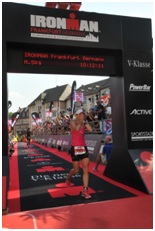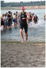 Nachdem ich im letzten Jahr bei meiner ersten Langdistanz schon mit der Hitze in Roth zu kämpfen hatte, war auch beim IM Frankfurt schnell klar, die Bedingungen werden wohl nicht besser. Ganz im Gegenteil: Prognostizierte Temperaturen von 40 Grad ohne Schatten, Neoverbot und diverse Sorgen von Eltern und Freunden, was ich mir da antue und ich soll ja auf mich aufpassen. Ich hatte mich nochmal eingehend mit den körperlichen Reaktionen bei Hitze beschäftigt, mir vorgenommen auf mich und Signale zu achten und das Rennen entsprechend vernünftig anzugehen. Ich startete Gott sei Dank in der ersten Schwimmwelle. Die Massen an Schwimmern mit blauen Badekappen aus der zweiten Welle schienen mich echt erdrücken zu wollen, wie sie da alle auf ihrem Hügel standen. Die Nationalhymne trieb mir ein paar Tränchen ins Auge und dann ging es ab ins Wasser. Was für ein Hauen und Stechen auf den ersten Metern. Daher entschied ich mich, mich nach außen zu kämpfen und habe dann für meine Verhältnisse schnell den Rhythmus im 27 Grad warmen Wasser gefunden. Nach 1:07 h und an Position 6 meiner AK hatte ich meine „Angstdisziplin“ geschafft.