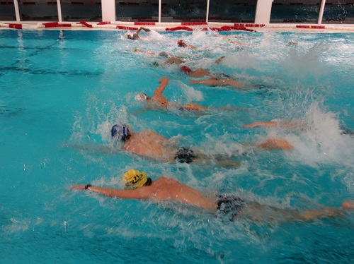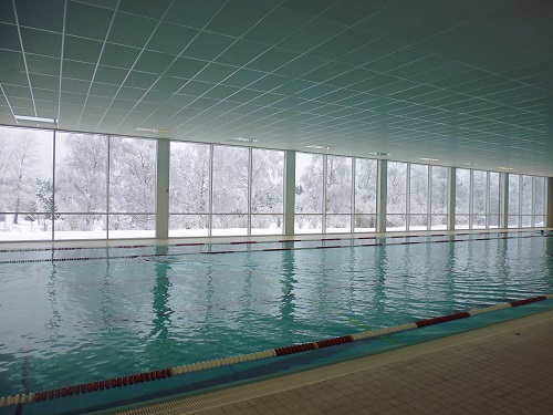 Gut gelaunt und ausreichend aufgewärmt schwärmten wir in die Sporthalle 1, wo Juliane Kummich uns schon sehnsüchtig erwartete, um uns mit stabilisierenden Trockenübungen im wahrsten Sinne des Wortes noch härter zu machen. Die letzen zwei der insgesamt sechseinhalb Stunden sportlicher Betätigung diesen Tages verbrachten wir in Schwimmhalle 2, einer 50m-Halle mit atemberaubender Aussicht aufs Winter Wonderland.