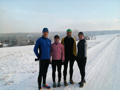Der Sonntag begann mit Schwimmtheorie. „Leichter gesagt als getan.“ – so gingen wir alle klüger aber wenig verbessert aus dem Seminar. Wir verstanden Zusammenhänge, Hintergründe und komplett neue Fakten. Auch hier vielen ein paar Groschen und wir konnten die Flammen unserer Erleuchtung in Schwimmhalle 1 gleich wieder löschen. Üben, üben, üben, denn noch ist kein Meister vom Himmel gefallen. Aber die Belohnung in Form von Eiweiß, Kohlenhydraten und zahlreich wohlschmeckenden Fetten folge sogleich. Danach stand Freizeit auf dem Plan. Was macht ein echter Triathlet in seiner Freizeit? Richtig: Triathlon. Geschwommen bin ich schon. Fahrrad gefahren bin ich auch schon, wenn auch nur unbewusst und ungewollt im feuchtem Metier. Also gingen wir Laufen. Laufen durch das Winter Wonderland Rabenberg. Es lag zwar noch zu wenig Schnee für die Ski, aber die Landschaft war atemberaubend schön. Da liefen wir doch gleich noch ein paar Kilometer mehr.