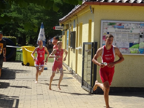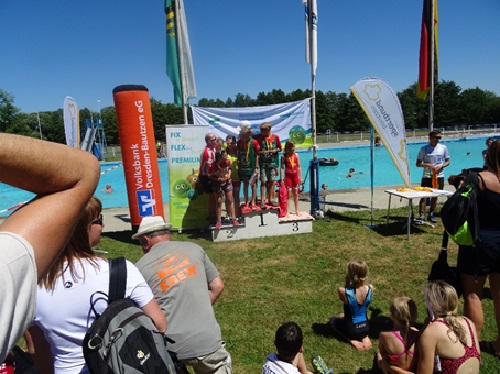 Als letztes fanden die Familienstaffeln statt. Es wurden 100m geschwommen, 2,4 km Rad gefahren und 400m gelaufen. Als erstes kamen die Ebereschen (Familie Eschler) ins Ziel, dahinter das Team Temposchnecken (Familie Matthes), der TV Dresden (Familie Bozenhard) und dann die Klotzscher Luftikusse (Familie Altmann).