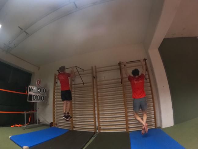 Nach dem Auslaufen fallen alle mehr oder weniger erschöpft auf den Boden - der Versuch das als "Dehnübungen" zu kaschieren gelingt nur bedingt. Einigen scheint das nicht gereicht zu haben - Aktion Strandkörper 2025 an der Klimmzugstange.